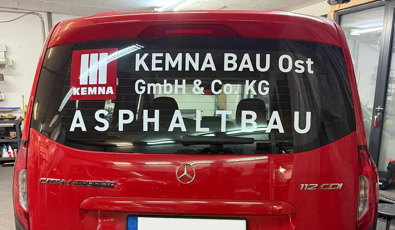 Die Beschriftung einer Heckscheibe besteht oft aus geschnittener Hochleistungsfolie. Diese Fahrzeugfolie ist Wetter-, Waschstraßen- und UV-beständig. Zugleich eignet sie sich zur Beschriftung von Autoglas. Wir empfehlen die Fensterbeklebung von Außen. Beim Entfernen von Aufklebern, die im Innenbereich montiert sind, können sonst aufgedampfte Heizdrähte an der Heckscheibe beschädigt werden.
