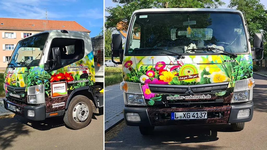 Ihre Werbebotschaft auf LKW oder Bus kann einfarbig als Folienschrift oder bunt im Digitaldruck gestaltet werden. Ganz so, wie Sie es wünschen. Auch Vollverklebungen über Karosserieteile oder Fensterflächen sind kein Problem. Kofferverbauten können zudem großflächig beklebt werden. Und das Führerhaus erhält ein tolles Truck Design.