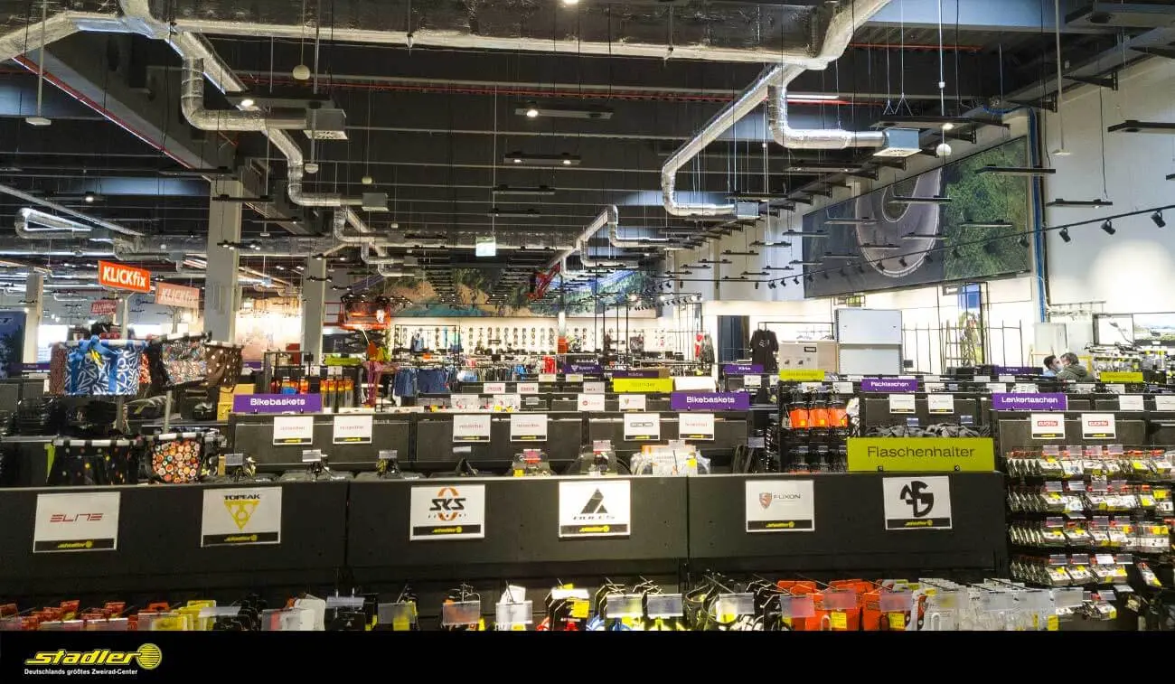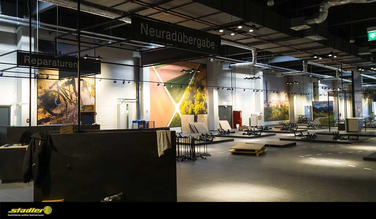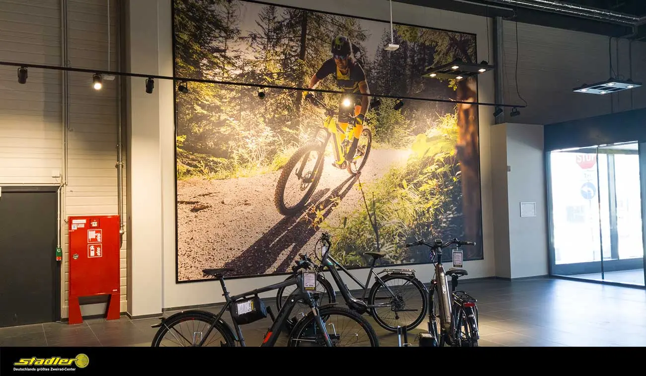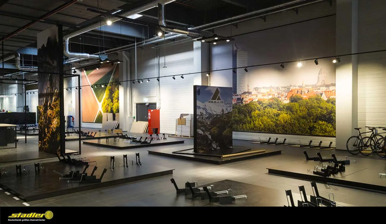 Stadler ist Deutschlands größtes Zweirad-Center. Das familiengeführte Fahrradgeschäft gibt es seit 1934. Das Unternehmen bietet eine gigantische Auswahl an Fahrrädern und allem, was dazugehört. Neben der kundenorientierten Beratung punktet Stadler mit einer Fahrradwerkstatt sowie kompetenten Mitarbeitern im Verkauf. Für den neuen Megastore im NOVA Eventis Leipzig-Halle durften wir riesige Bannersysteme drucken, liefern und montieren.