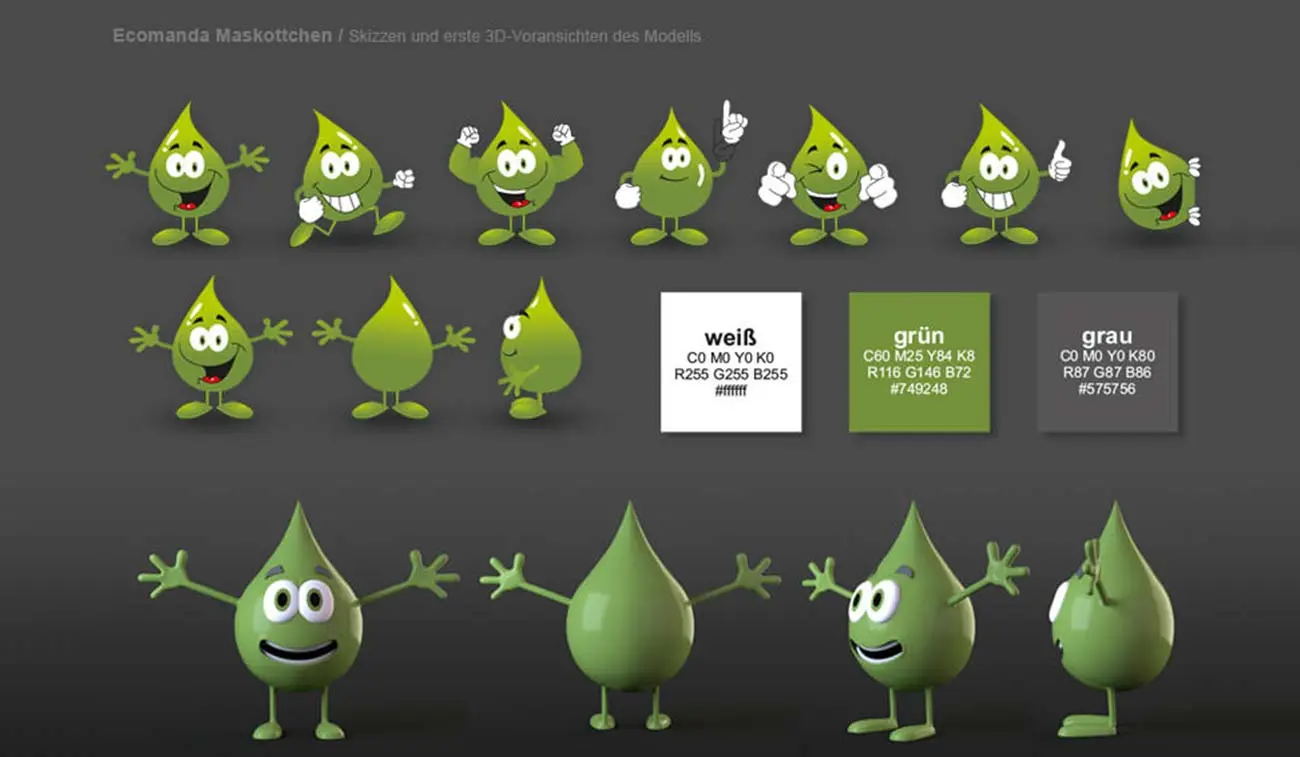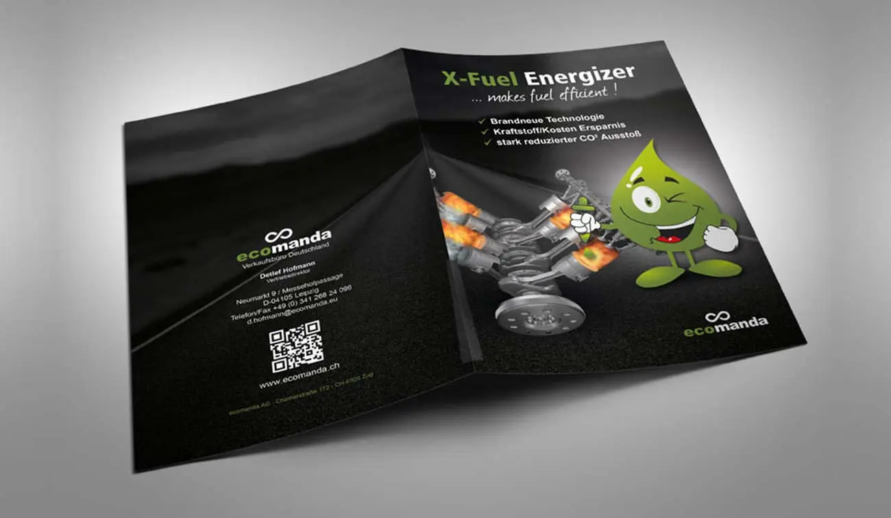 Für Ecomanda gestalteten wir eine Vielzahl von Printprodukten wie Geschäftspapiere, Broschüren, Aufkleber und Flyer. Auch das Maskottchen entwickelten wir von der Skizze bis hin zur finalen Anwendung. Das Unternehmen hat einen Zusatzstoff entwickelt, der im Fahrzeugmotor ein effizienteres Verbrennungsverhalten ermöglicht.