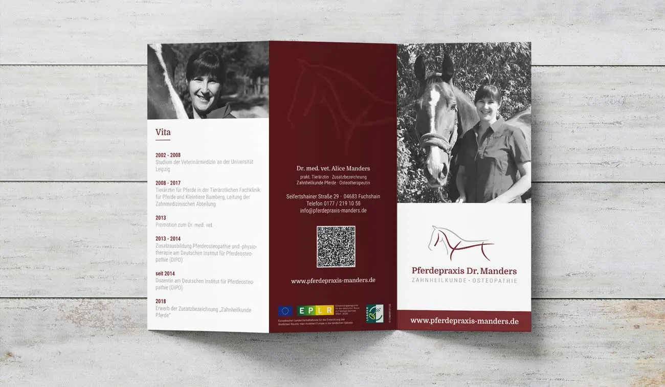 Für die mobile tierärztliche Praxis von Frau Dr. Alice Manders haben wir zur Eigenwerbung in Leipzig und Umgebung einen Imageflyer erstellt. Spezialisiert auf die Zahnheilkunde und Osteopathie für Pferde kommuniziert die Praxis die eigenen Leistungsbereiche und stellt die Ärztin vor.