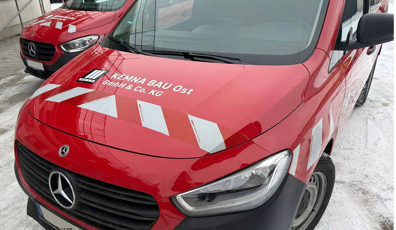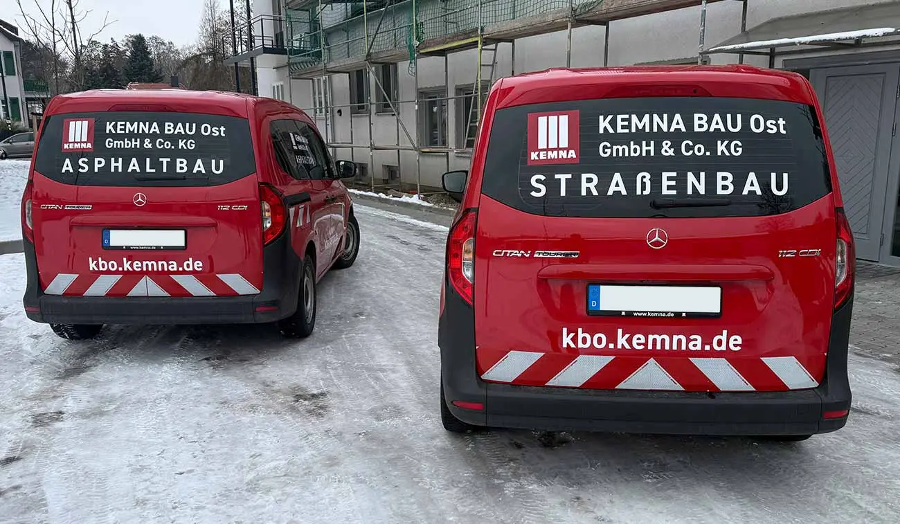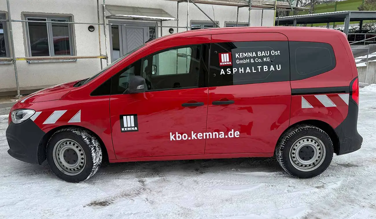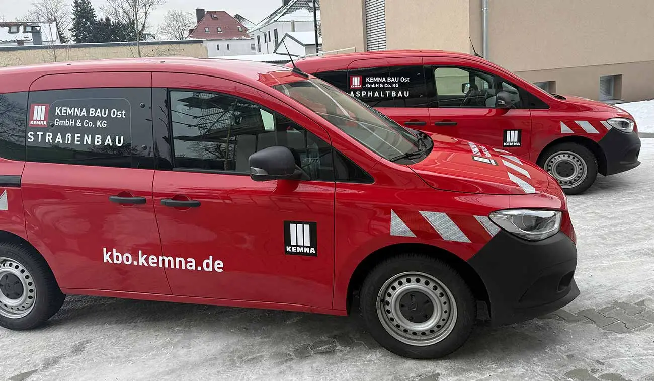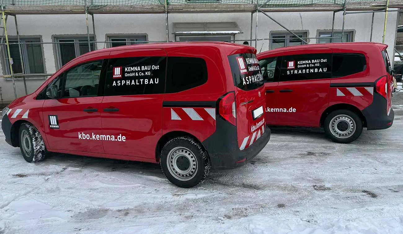 Die KEMNA BAU Ost GmbH & Co. KG (KBO) ist ein spezialisiertes Bauunternehmen für Verkehrswege mit Sitz in Leipzig. Die Fahrzeugflotte des Unternehmens ist riesig. Mit unseren Flottenbeschriftungen lassen wir alle Firmenfahrzeuge im gleichen Look erstrahlen. Mit einem einheitlichem Design passen wir verschiedenste Fahrzeugtypen auf das Corporate Design an. Parallel zur Fahrzeugbeschriftung der beiden Mercedes Benz Citan erfolgte auch die Scheibentönung. Wir wünschen unserem Kunden allzeit gute Fahrt und zahlreiche Sichtkontakte!