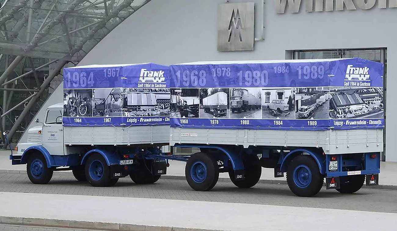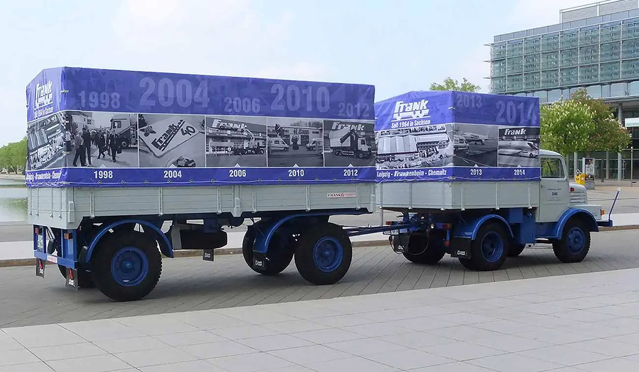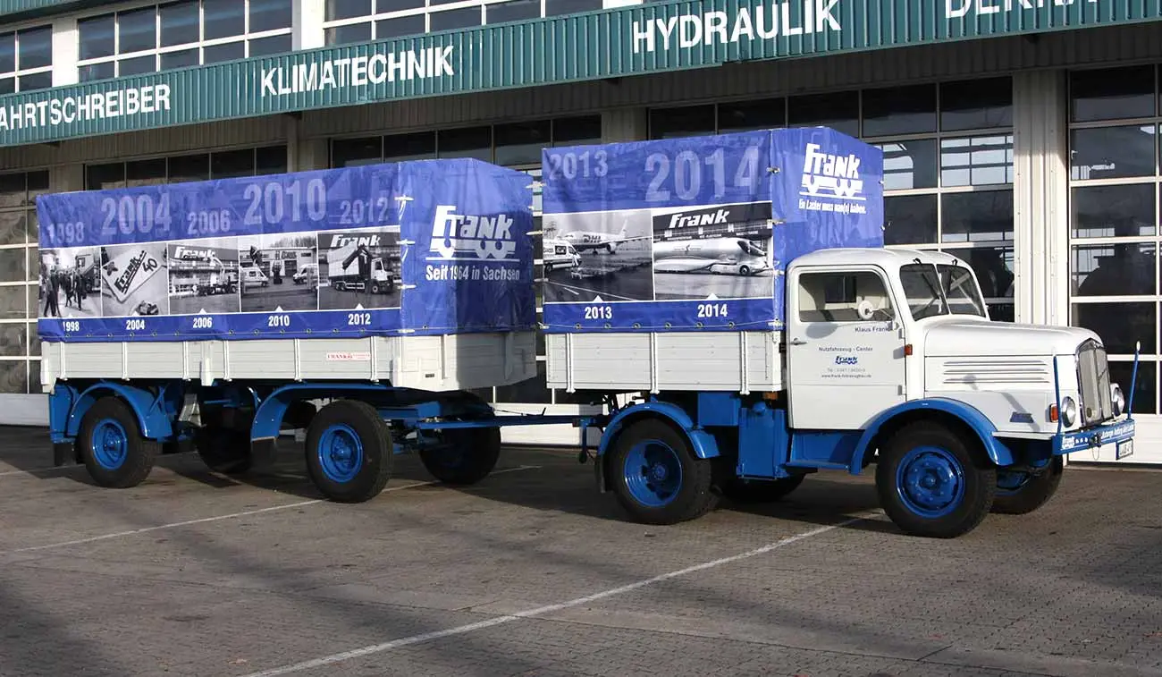 Frank Fahrzeugbau ist seit 1964 der Spezialist für Nutzfahrzeuge und Diesel-Motoren. Zur Leistungspalette zählen neben LKW-Aufbauten, ein Nutzfahrzeug-Service, die Reparatur von Dieselmotoren und der Fahrzeugteilegroßhandel. Zur Eigenwerbung sollte ein außergewöhnliches Fahrzeug zum Einsatz kommen, welches die Branche und Tradition des Unternehmens verkörpert. Die Wahl fiel auf einen Oldtimer IFA S4000 Pritschenwagen. Das Promotionfahrzeug wird auf Events, Messen und als rollender Werbeträger eingesetzt.