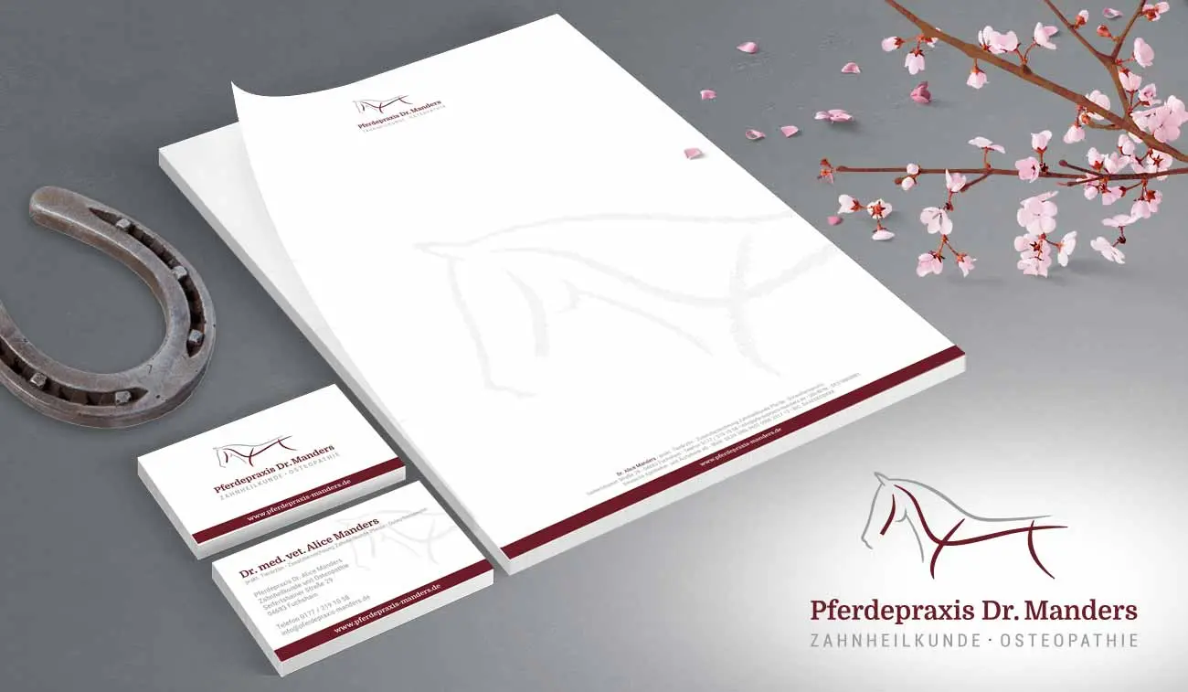 Für die mobile Tierärztin Dr. Alice Manders wurde ein Corporate Design erstellt, das nach klaren Vorstellungen der Kundin umgesetzt wurde. Neben der Namensfindung und Farbkonzeption wurde ein Logo gestaltet, welches auf Briefpapier, Visitenkarten, Firmenstempel und Autobeschriftung Anwendung fand. Auch die Internetpräsenz wurde von uns realisiert, um das Praxismarketing komplett zu machen. Das moderne und frische Corporate Design kommuniziert eindeutig, dass die Gesundheit und das Wohl der Pferde im Vordergrund stehen.