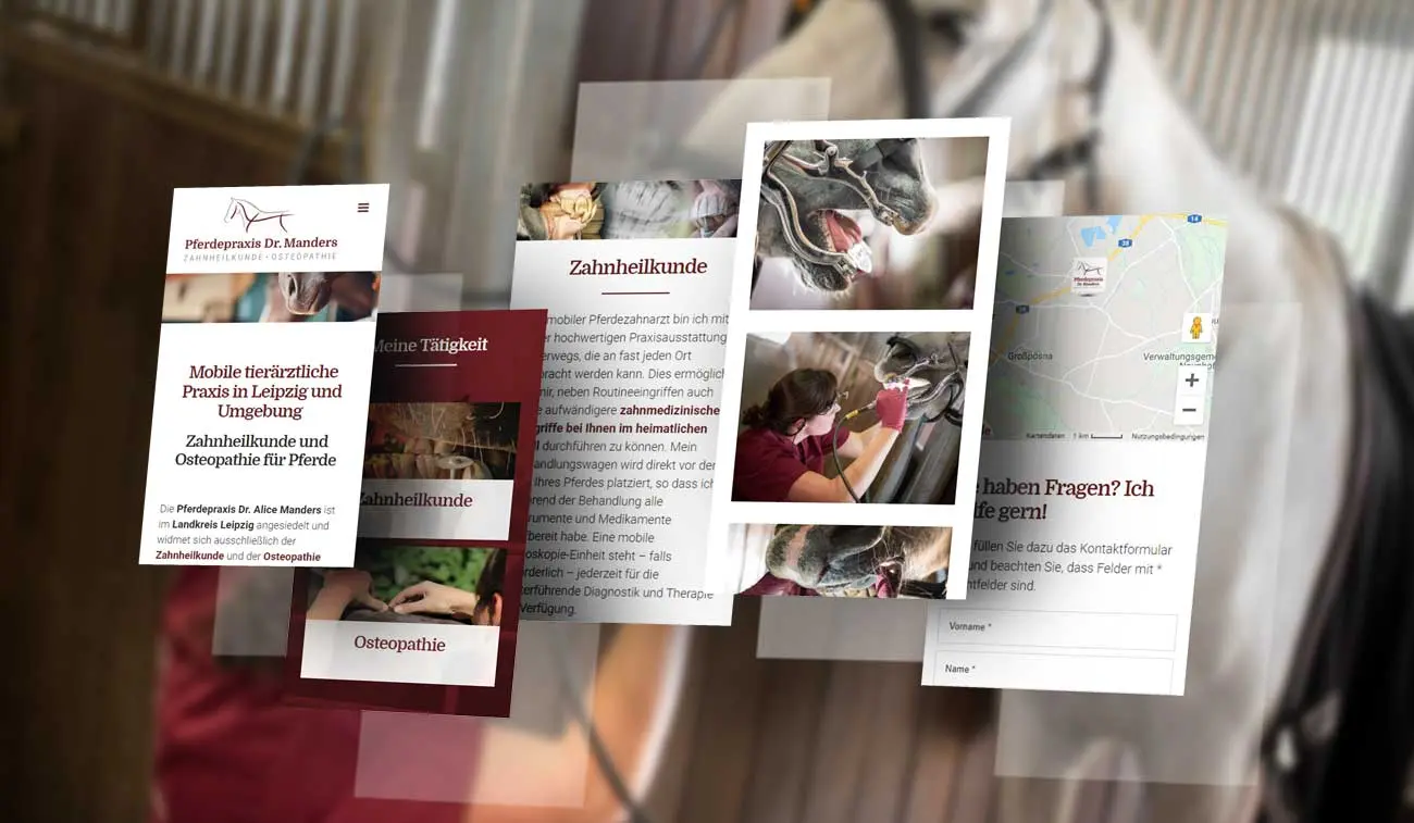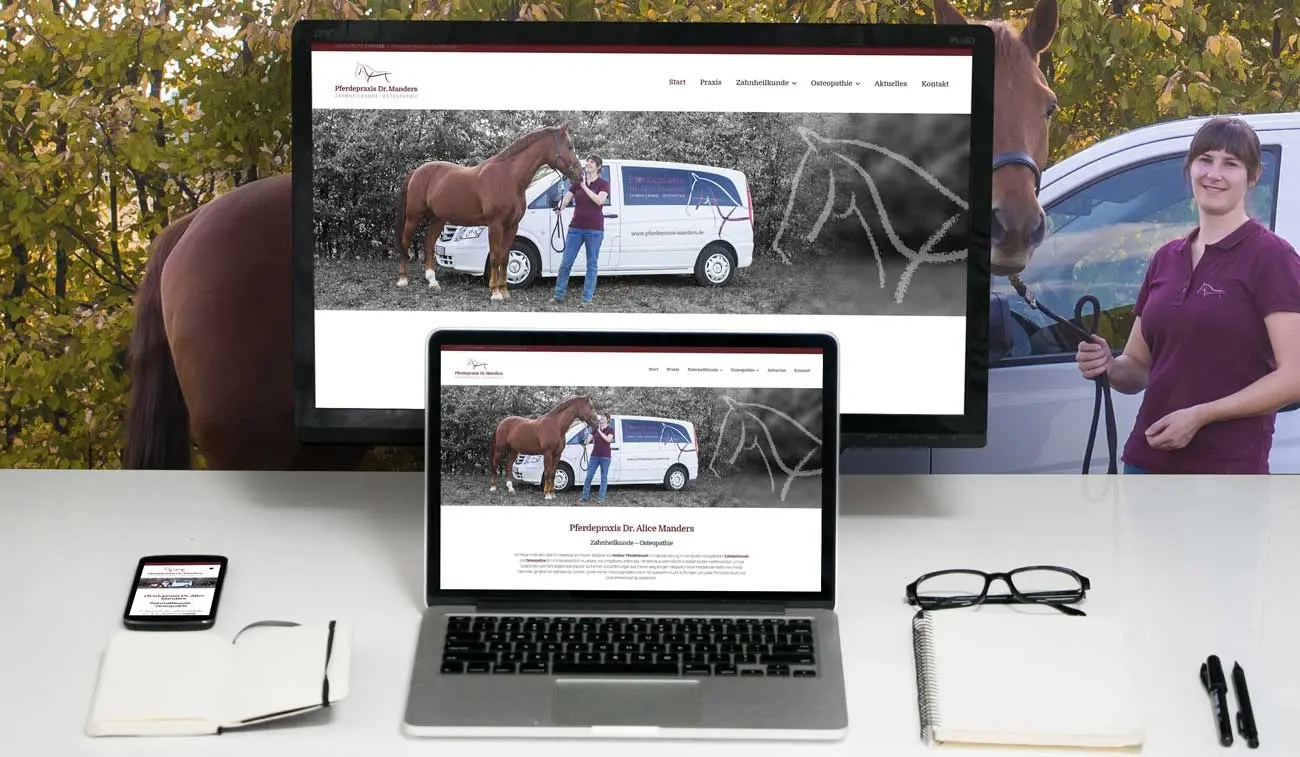 Die Veterinärmedizinerin beauftragte uns mit der Erstellung einer Praxishomepage inklusive Suchmaschinenoptimierung. Alle zentralen Aspekte der Website wurden in enger Zusammenarbeit mit Frau Dr. Manders entwickelt. Angefangen bei ersten konzeptionellen Überlegungen über die Gestaltung bis hin zur technischen Umsetzung. Das Webdesign basiert auf einem Content-Management-System zur eigenständigen redaktionellen Pflege.