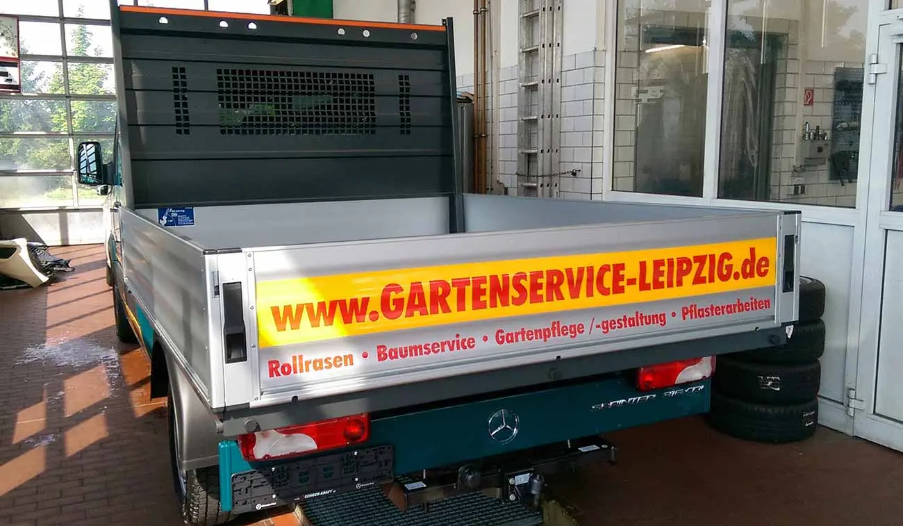Bei einer Fahrzeugwerbung kommt es auf die Optik an! Was für Werbemaßnahmen im Allgemeinen gilt, trifft erst recht auf Autobeschriftung zu. Besonders wichtig sind die klare Gestaltung sowie schnelle Wahrnehmung im rollenden Verkehr. Die mehrfarbige Beschriftung der Pritsche bringt in kurzer und prägnanter Ausführung sämtliche Dienstleistungen der Gartenbaufirma auf den Punkt.