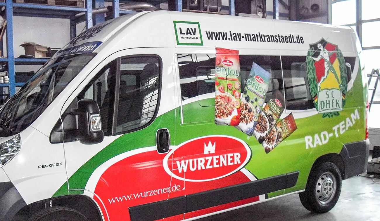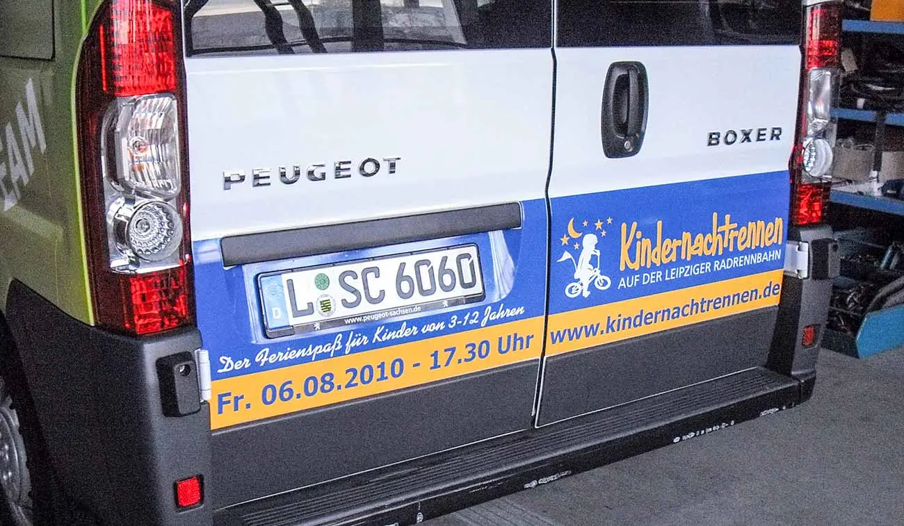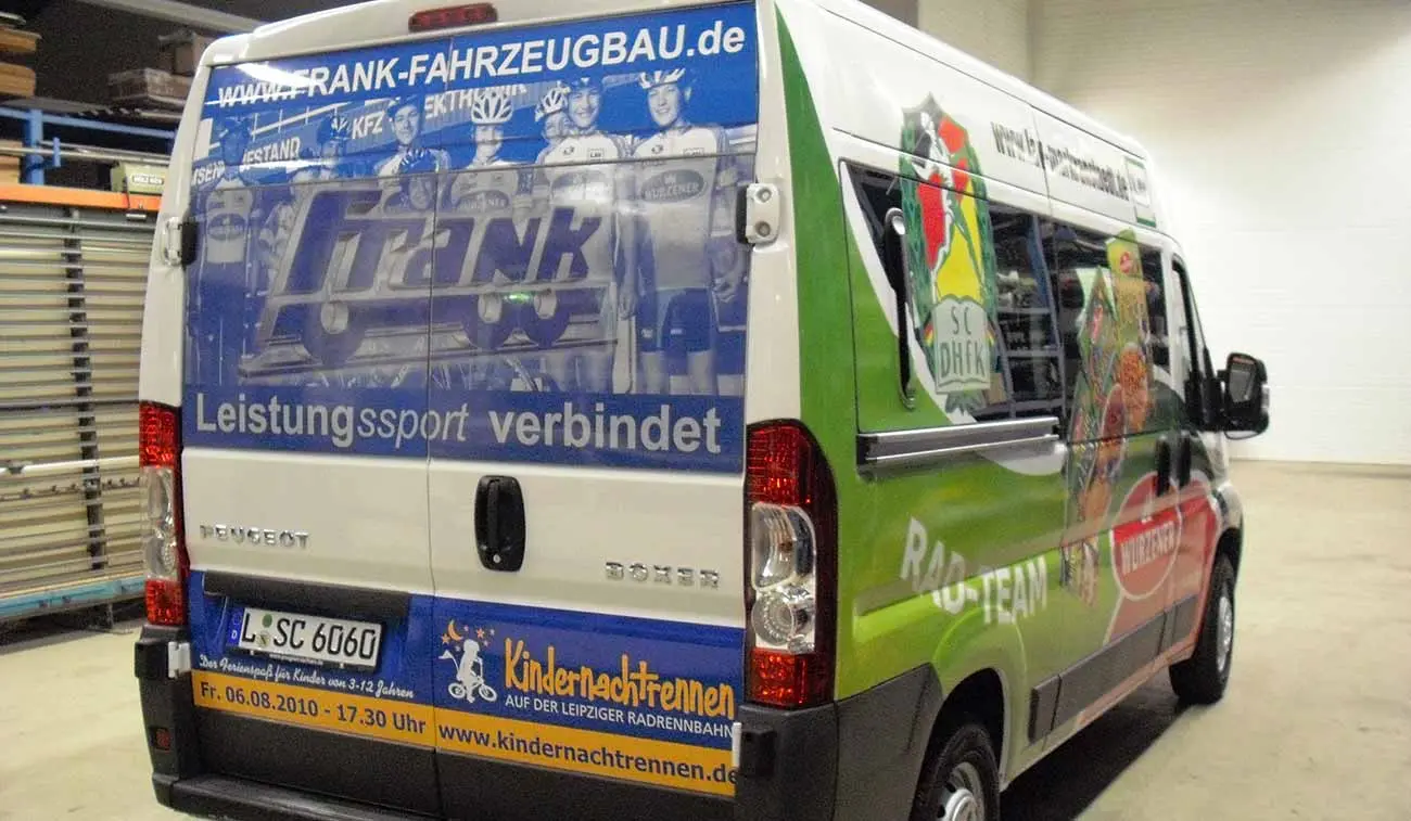 Für die Frank Fahrzeugbau GmbH beklebten wir das Sponsorfahrzeug der SC DHfK Abteilung Radsport. Der Peugeot Transporter strahlt mit der neuen Transporterbeschriftung, die aus Digitaldrucken auf Window Grafx und konturgeschnittener Folien gefertigt wurde. Durch den UV Schutzlack ist die Beschriftung nicht anfällig auf das Ausbleichen der Farbe durch Sonneneinstrahlung.