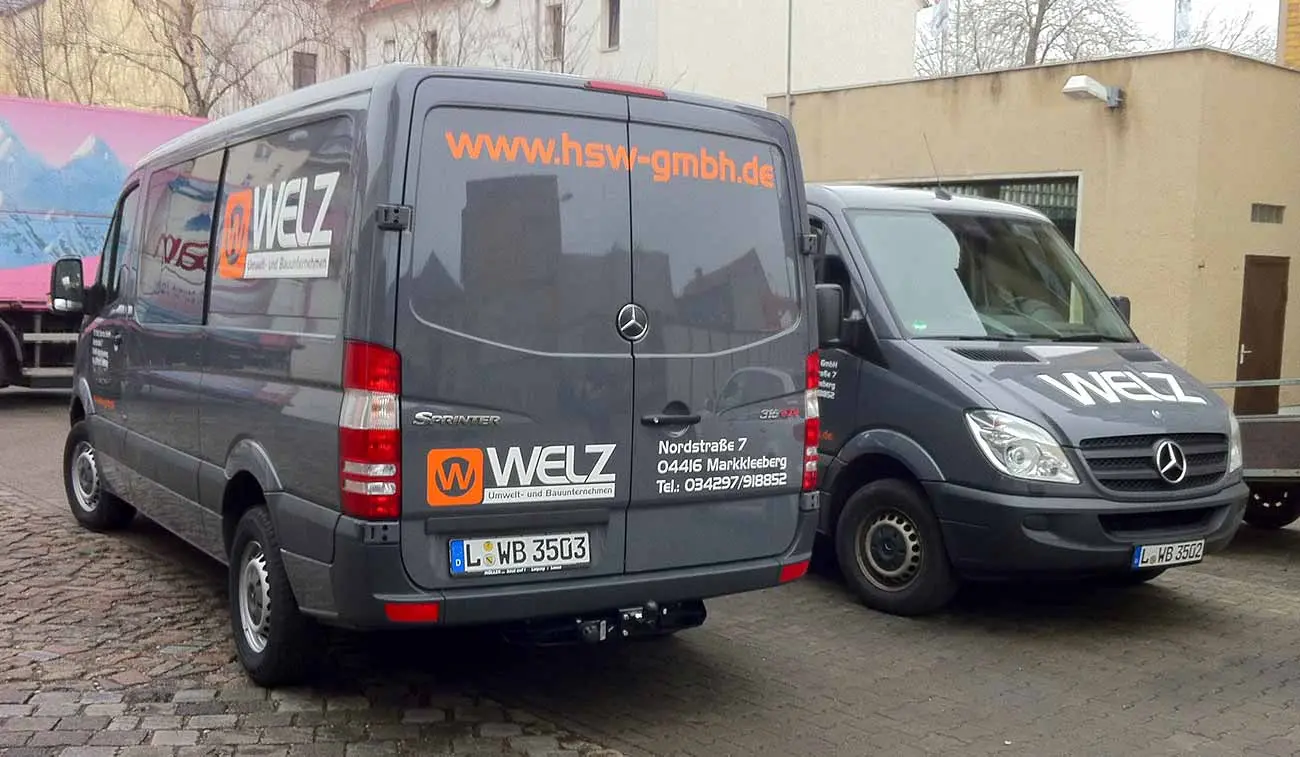 Die Fahrzeuge der Baufirma HS WELZ befördern Mitarbeiter und Waren zu Kundenbaustellen. Durch das Branding mit moderner Folientechnik fallen die Transporter nicht nur auf, sondern transportieren als rollende Werbeträger alle wichtigen Kontaktdaten. Da der Kunde besonderen Wert auf eine langfristige Transporterbeschriftung legte, setzten wir ausschließlich Hochleistungsfolien ein und verzichteten bewusst auf Digitaldrucke, welche mit der Zeit ausbleichen können. Die rollende Werbung kennzeichnet das Unternehmen auf Baustellen und im Straßenverkehr.