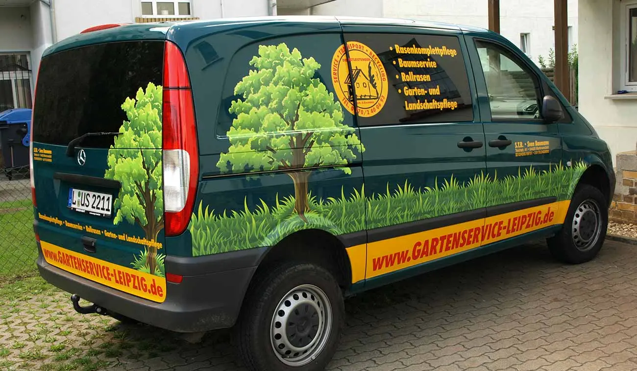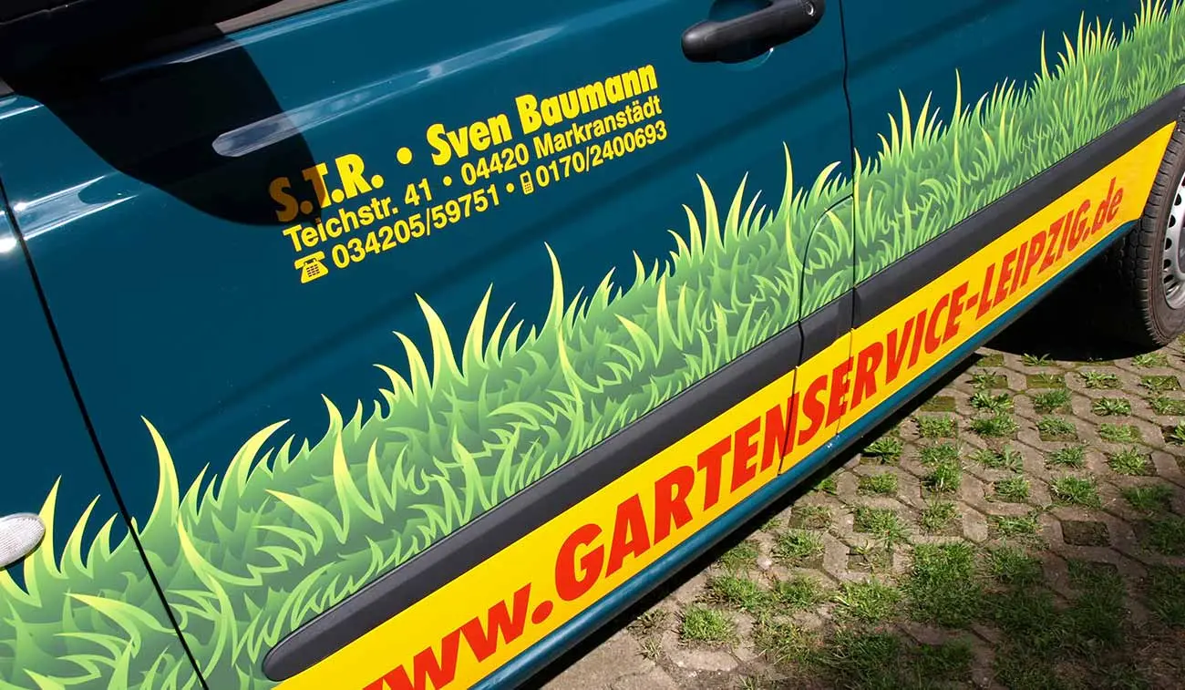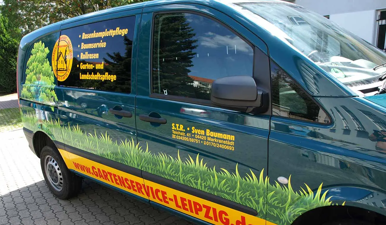 Die Projektaufgabe für die Leipziger Werbeagentur COMARTIST war es, eine unübersehbare Transporter-Werbung für die Gartenbaufirma S.T.R. Baumann zu gestalten. Die final angebrachte Fahrzeugwerbung wird aufgrund der kontrastreichen Farben stark von Passanten und Verkehrsteilnehmern wahrgenommen und sorgt für eine sehr gute Resonanz beim Handwerksbetrieb. Durch den Gebrauch von gegossenen Folien waren Fahrzeugsicken und Kanten hier kein Tabu. Die Kombination von Digitaldrucken und computergeschnittenen Hochleistungsfolien führt zu einem durchaus anspruchsvollen und ausdruckstarken Erscheinungsbild.