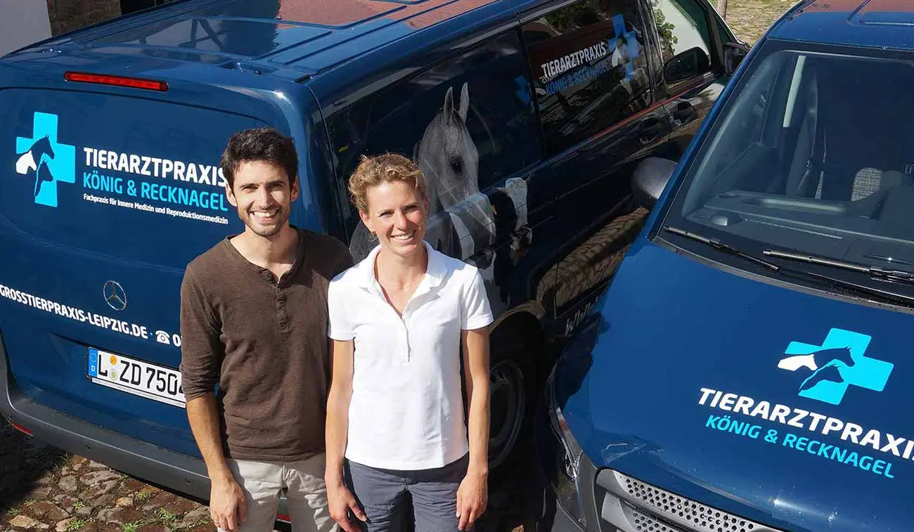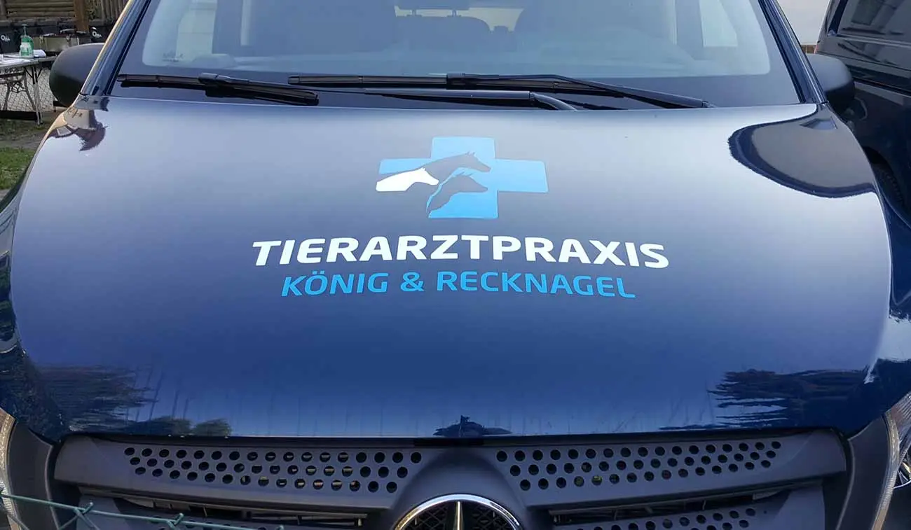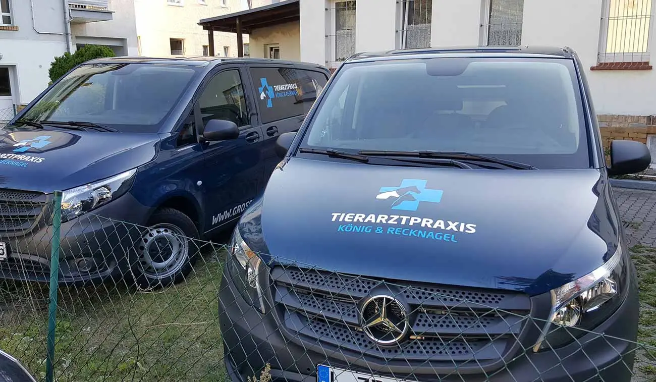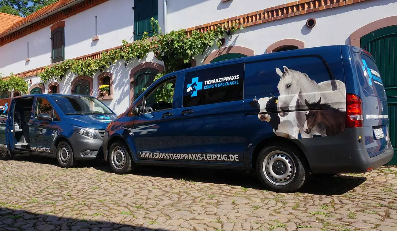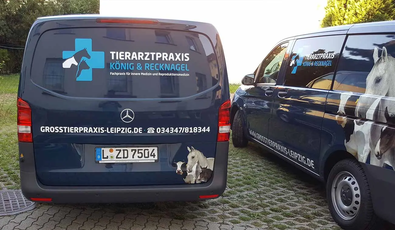 Große Digitaldrucke und ein puristisches Design prägen die Transporterbeschriftungen der Tierarztpraxis König und Recknagel. Die Mercedes Vitos erstrahlen im Partnerlook und zeigen nach Außen die Branchenzugehörigkeit der mobilen Tierärzte. Für einen einheitlichen Auftritt auf den Straßen von Leipzig.
