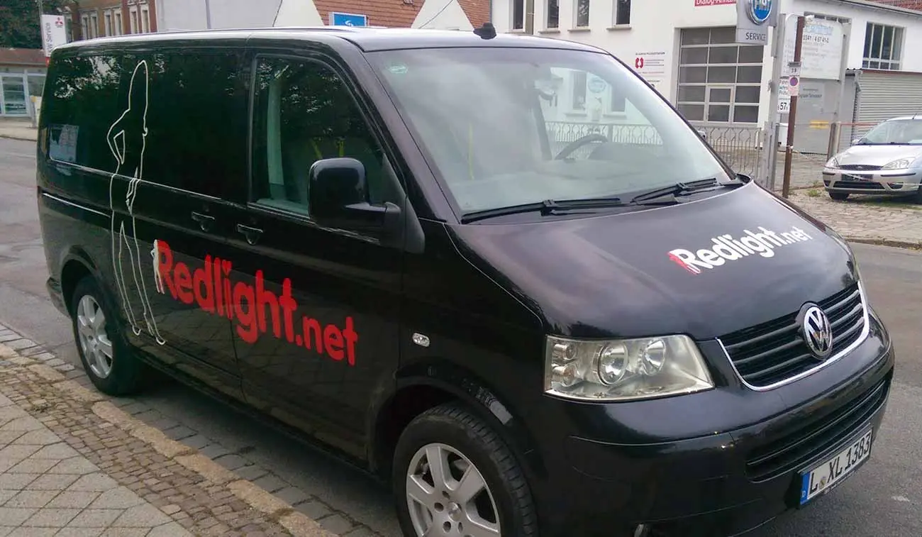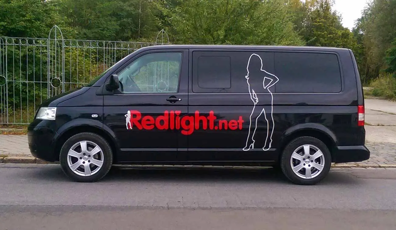 Die reflektierende Transporterbeschriftung ist eine der auffälligsten Arten der Werbung auf Fahrzeugen. Für das Onlineportal Redlight kamen reflektierende Folien in Form von computergeschnittener Schriften und Formen zum Einsatz. Das zweifarbige Logo wird in der Nacht angestrahlt und leuchtet wie ein Neonschriftzug.
